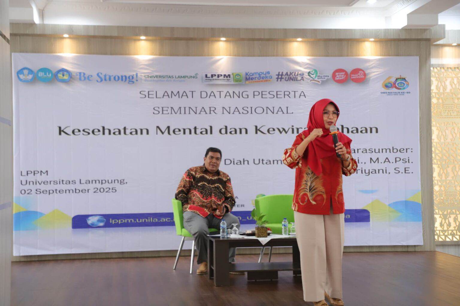 Rektor Universitas Lampung (Unila), Prof. Dr. Ir. Lusmeilia Afriani, D.E.A., IPM., membuka seminar nasional dengan tema “Kesehatan Mental dan Kewirausahaan” bersama Ikatan Keluarga Purnabakti Unila (IKPA) dalam rangka Hari Ulang Tahun (HUT) IKPA ke-7 pada 2 September 2025, di Perpustakaan Fakultas Ekonomi dan Bisnis (FEB) Unila.