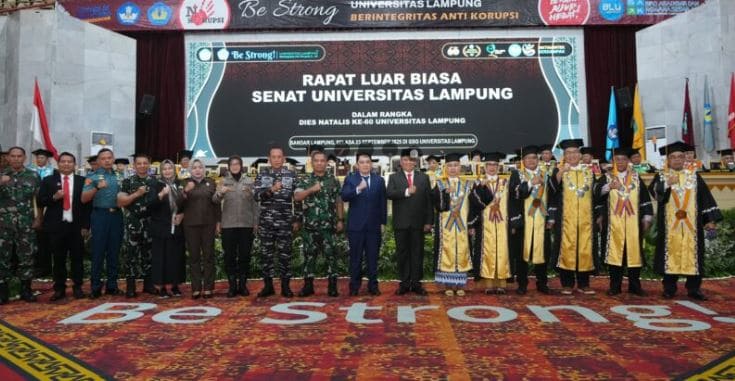 Universitas Lampung (Unila) menggelar sidang senat terbuka sebagai acara sakral puncak Dies Natalis ke-60 di Gedung Serba Guna (GSG) Unila. Perayaan enam dekade ini dihadiri jajaran pimpinan universitas, civitas akademika, alumni lintas angkatan, serta perwakilan instansi pemerintah dan mitra kerja, pada Selasa, 23 September 2025.