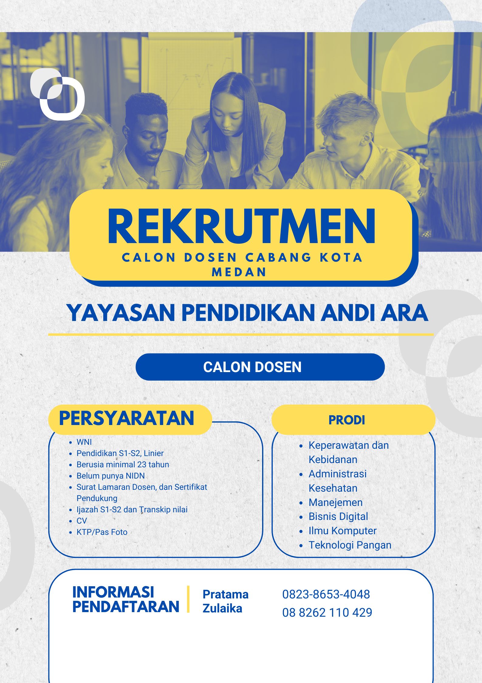 MEDAN|PERS.NEWS-Yayasan Pendidikan Andi Ara membuka rekrutmen calon dosen untuk cabang barunya di Kota Medan. Kesempatan ini dibuka bagi lulusan S1 dan S2 linier yang memiliki semangat mengajar dan berkomitmen membangun dunia pendidikan, 26/10/25.