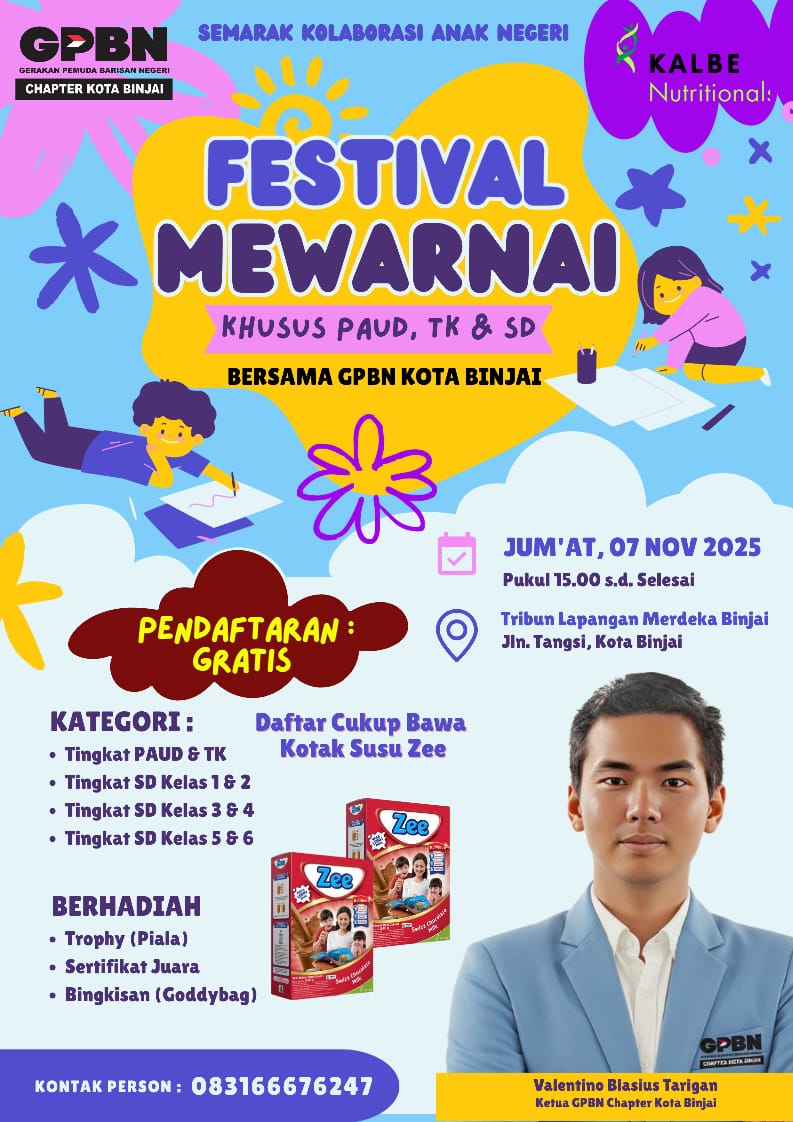 Hanya dalam dua hari sejak dibuka, jumlah peserta yang mendaftar sudah membludak jauh di atas target awal. Lomba yang diperuntukkan bagi anak-anak tingkat TK/PAUD dan SD ini akan digelar pada Jumat, 7 November 2025 mendatang di Tribun Lapangan Merdeka Binjai.(3/11/25)