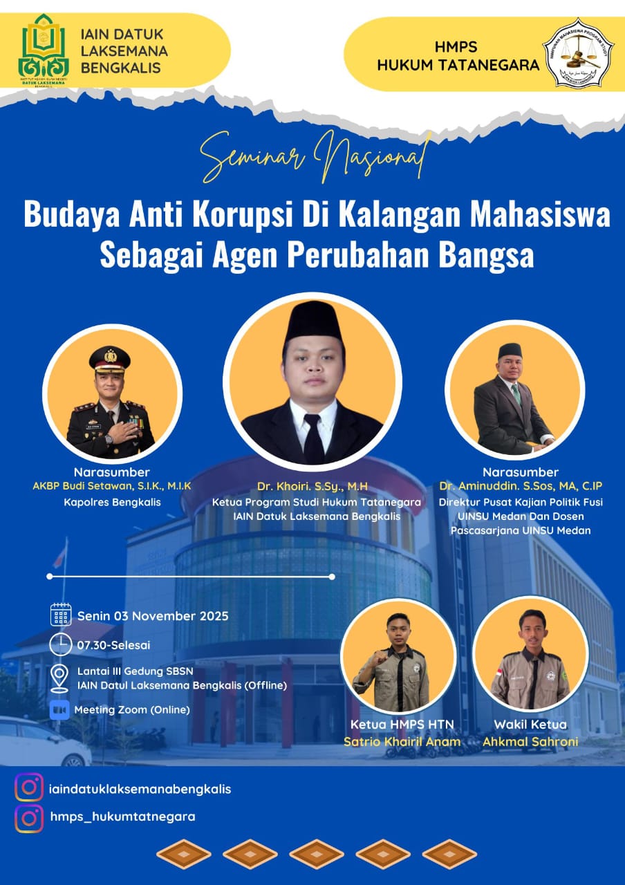 MEDAN|PERS.NEWS- Sosok akademisi dan tokoh pendidikan Sumatera Utara, Dr. Aminuddin, S.Sos., M.A., C.IP, kembali tampil di panggung nasional sebagai narasumber utama dalam Seminar Nasional bertema “Budaya Anti Korupsi di Kalangan Mahasiswa sebagai Agen Perubahan Bangsa” yang digelar oleh Himpunan Mahasiswa Program Studi (HMPS) Hukum Tata Negara IAIN Datuk Laksamana Bengkalis, 3 November 2025