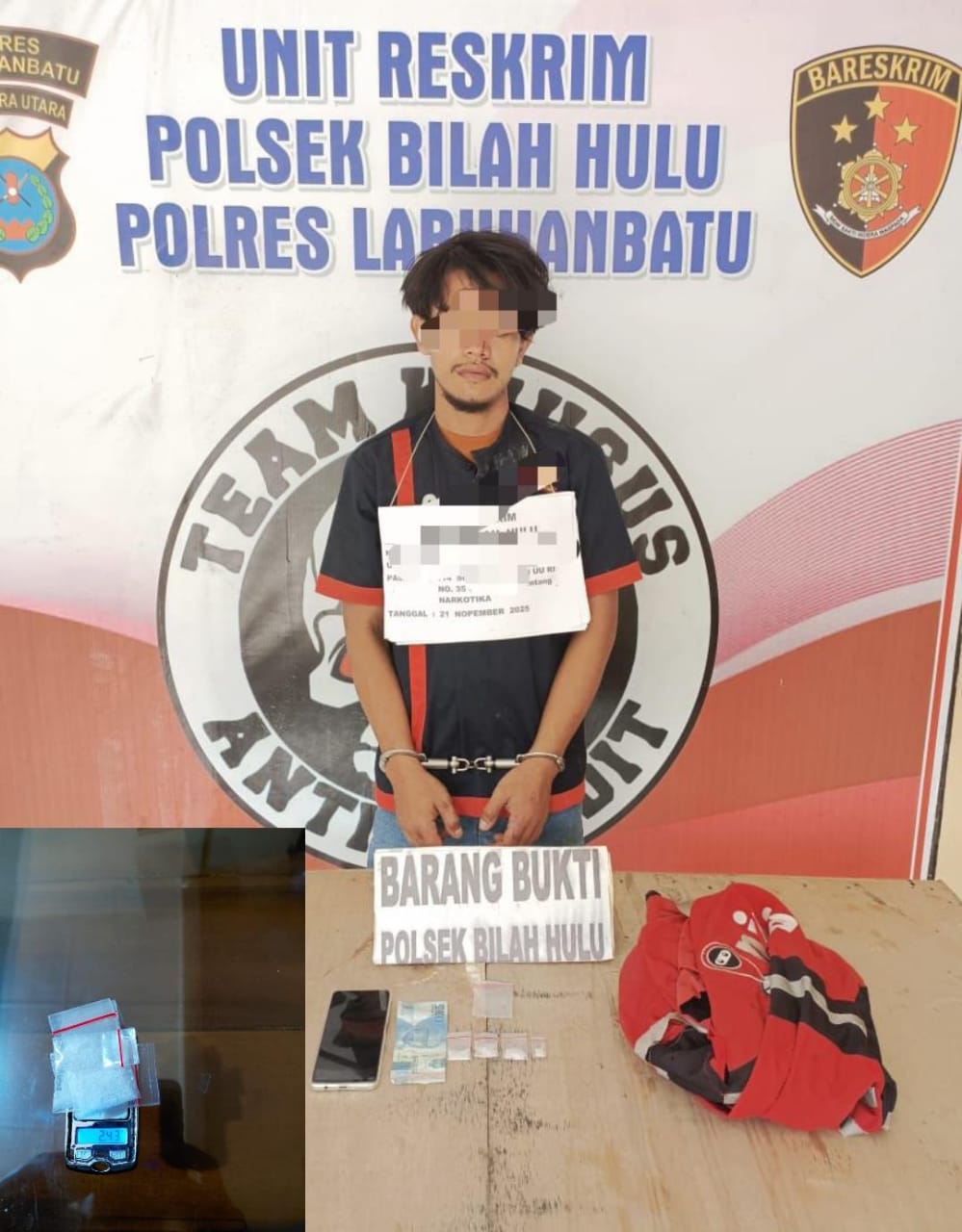 Pelaku berinisial J (26), seorang pelajar/mahasiswa asal Lingkungan Sidorejo, Kecamatan Rantau Selatan. Sementara satu rekannya berhasil melarikan diri saat petugas melakukan penindakan. Dari lokasi, polisi berhasil menyita 4 bungkus plastik klip berisi sabu seberat 2,43 gram, 1 bungkus plastik klip kosong, uang tunai Rp 50.000, 1 unit handphone Realme warna krem, serta jaket merah yang digunakan tersangka.
