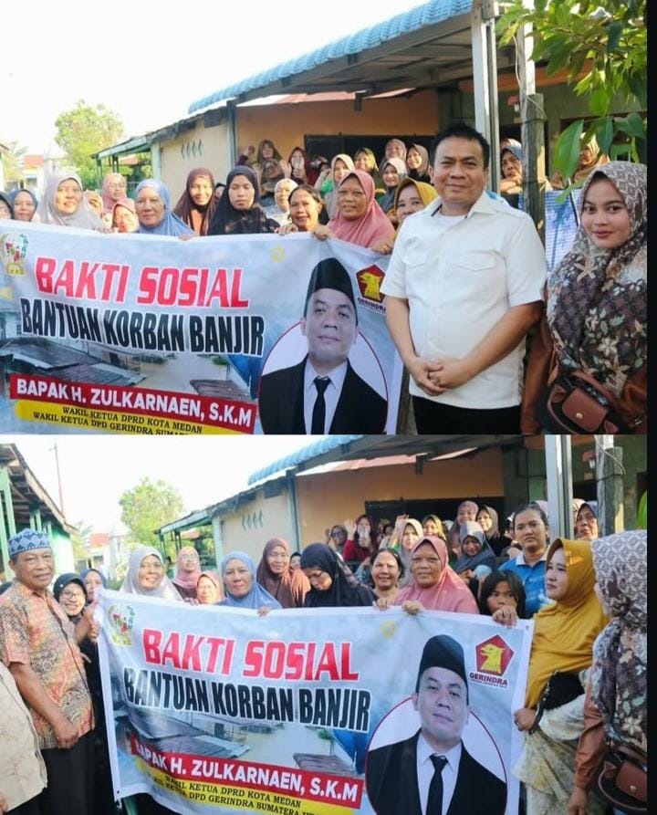 Curah hujan tinggi dalam beberapa hari terakhir menyebabkan sejumlah kawasan tergenang air hingga mengganggu aktivitas warga. Menyikapi kondisi tersebut, Zulkarnaen segera bergerak menyalurkan bantuan bahan pangan kepada ratusan kepala keluarga di tiga titik terdampak banjir, yakni Jalan Platina V Gang Bersama dan Jalan Platina II Gang Keluarga di Kelurahan Titipapan, Kecamatan Medan Deli, serta kawasan Jalan Veteran di Kecamatan Medan Timur.