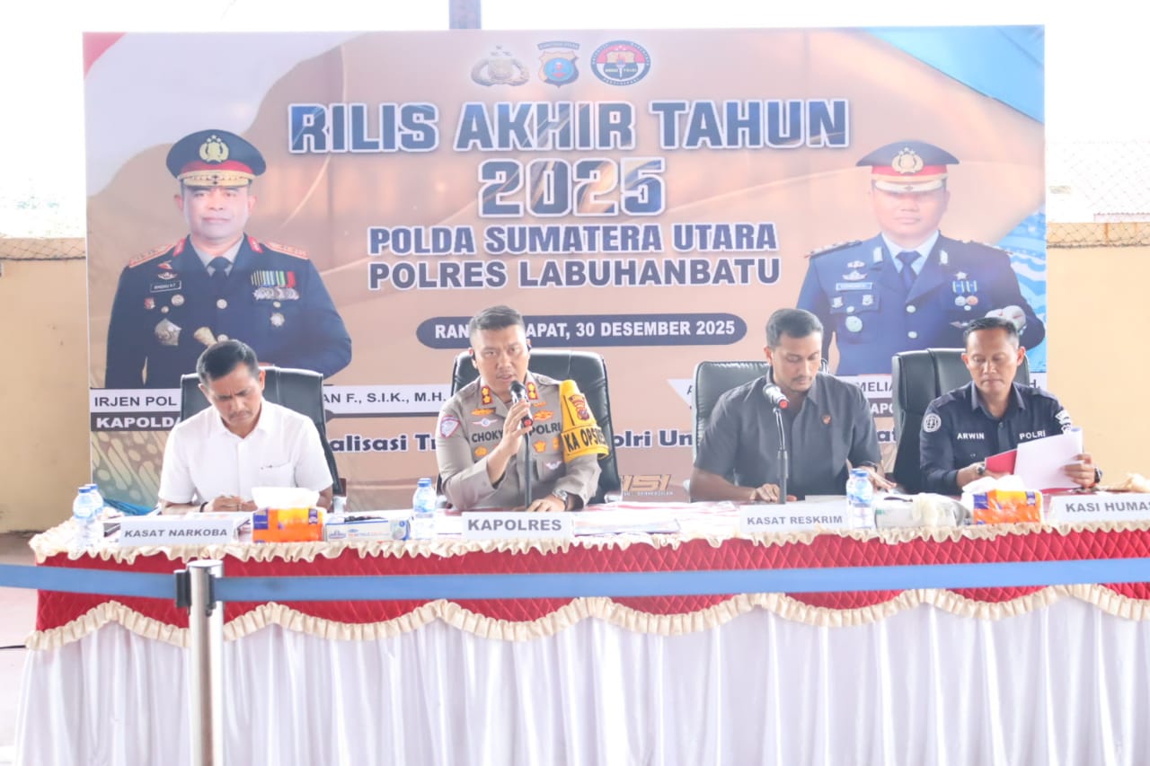 LABUHANBATU|PERS.NEWS– Polres Labuhanbatu menggelar Rilis Akhir Tahun 2025 yang berlangsung di Gedung Serbaguna Polres Labuhanbatu, Jalan MH. Thamrin, Rantauprapat, Kabupaten Labuhanbatu, pada Selasa (30/12/2025). Kegiatan ini dipimpin langsung oleh Kapolres Labuhanbatu, AKBP Choky Sentosa Meliala, S.I.K., S.H., M.H., serta dihadiri para pejabat utama, personel Polres Labuhanbatu, dan awak media.